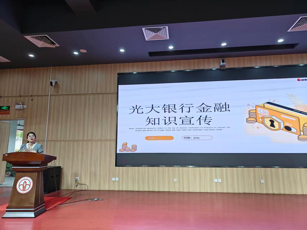 活动现场,光大银行较场西路支行工作人员通过案例讲解,向同学们讲解了洗钱犯罪的常见形式、洗钱的概念及反洗钱的意义,详细阐述了常见的洗钱手法及其防范措施,从看似无害的网络兼职陷阱,到复杂的金融交易骗局,一个个生动的案例让学生们深刻认识到洗钱活动可能就隐藏在身边。知识互动有奖答题环节,同学们踊跃参与,大家纷纷举手抢答,现场气氛活跃。防范洗钱活动方法的传授环节,更是干货满满。工作人员强调要保护好个人信息,不随意向他人透露身份证号、银行卡号等重要资料。对于不明来源的金钱交易要保持警惕,拒绝参与任何形式的非法金融活动。此外,还介绍了发现可疑洗钱行为的举报途径,鼓励同学们积极参与到反洗钱的行动中来。