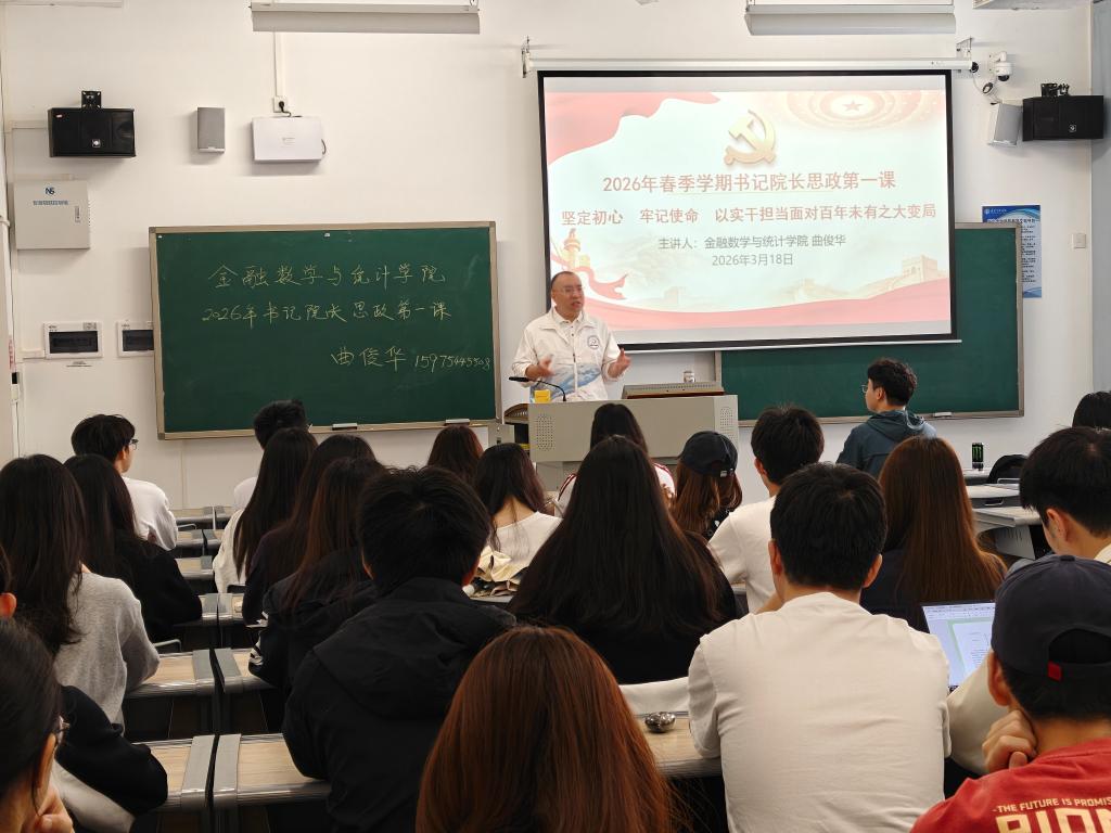 为学习贯彻习近平新时代中国特色社会主义思想,深入学习宣传党的二十届四中全会和2026年全国两会精神,教育引导广大学子认清形势、科学规划,积极投身中国式现代化的广东实践,金融数学与统计学院于3月23日开展了党委书记、院长上第一堂思想政治理论课。学院党委书记曲俊华,院长刘炎教授分别为学生授课。学生党员、入党积极分子、清远校区和校本部学生代表们参与聆听了课程。