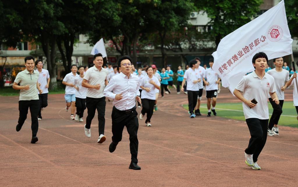 易行健校长宣布学校学生体质强健行动正式启动暨男女混合接力跑比赛正式开赛!他带领各二级学院参赛学生们一同在田径运动场跑步热身,并为参赛同学们加油打气,鼓励大家努力拼搏力争取得好成绩。